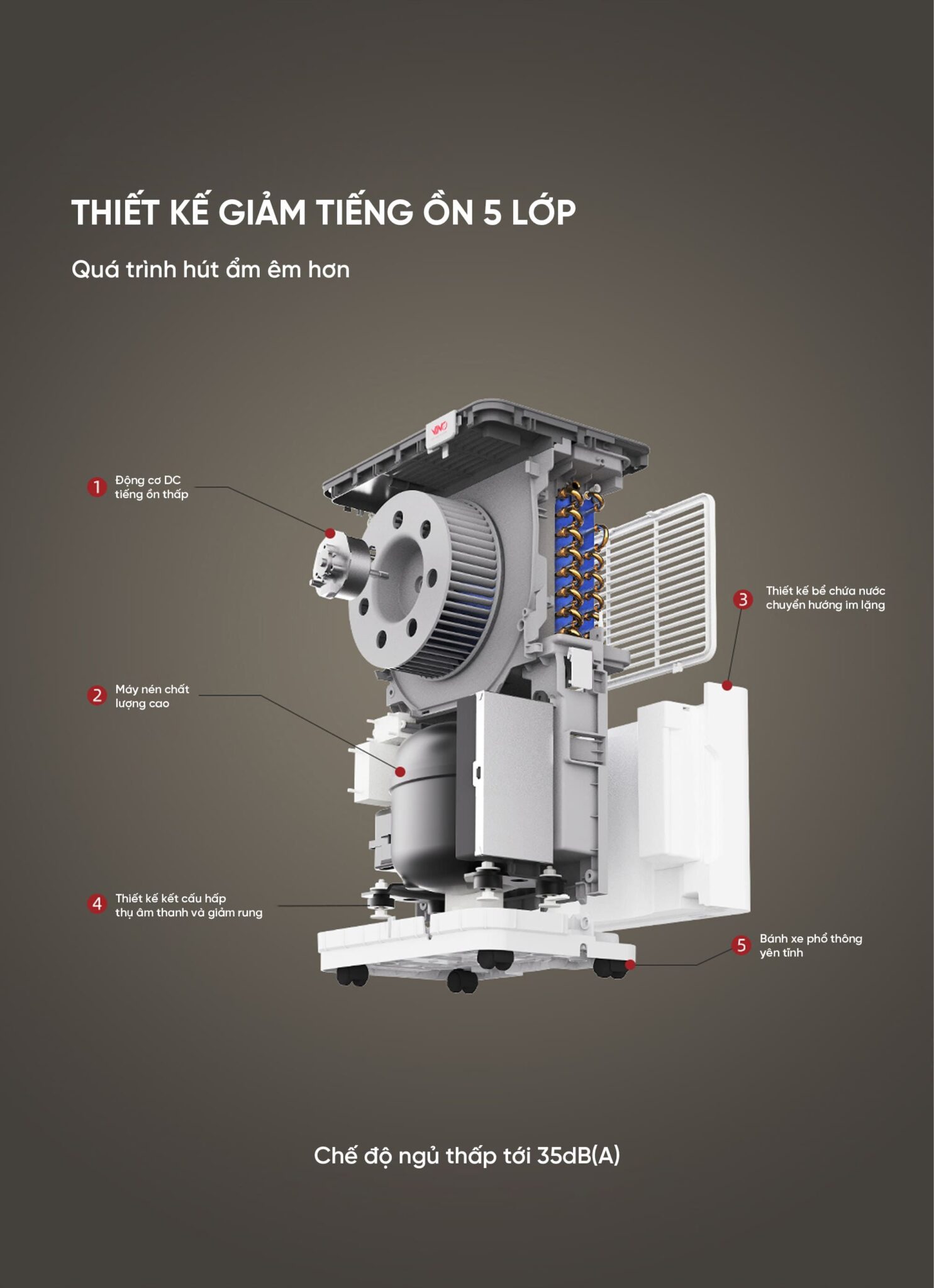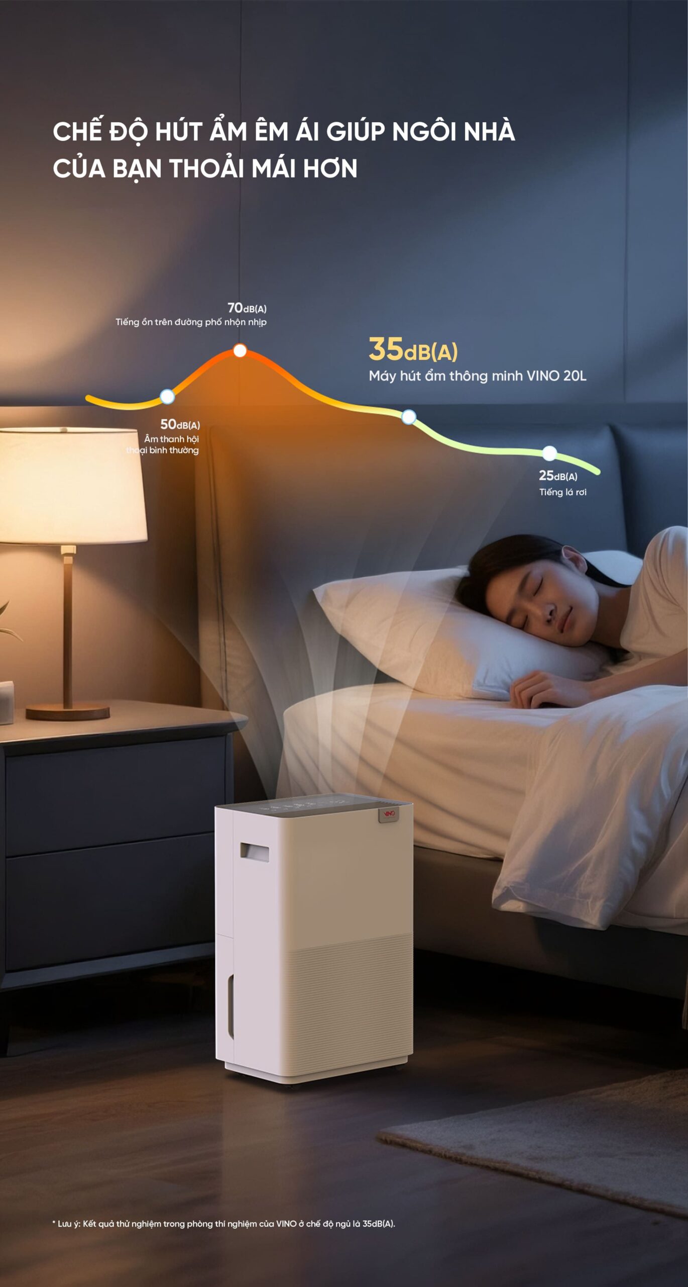 Máy hút ẩm VINO (35dB) yên tĩnh hơn nhiều so với tiếng ồn đường phố (70dB) hay cuộc trò chuyện bình thường (50dB), hoàn hảo cho không gian sống.