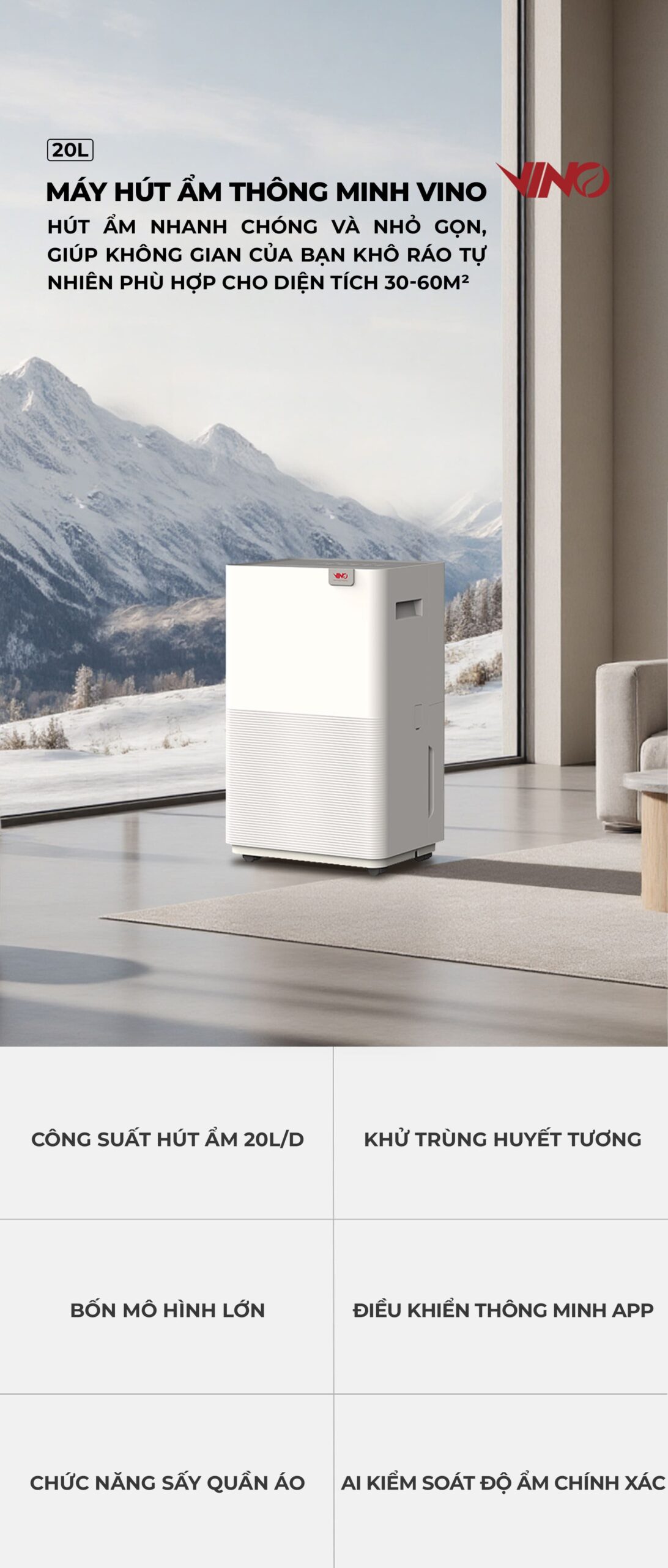 Trong điều kiện khí hậu nồm ẩm đặc trưng, việc sở hữu một chiếc máy hút ẩm không còn là xa xỉ mà trở thành nhu cầu thiết yếu của mọi gia đình. Máy Hút Ẩm Thông Minh VINO 20L ra đời như một giải pháp công nghệ toàn diện, không chỉ loại bỏ độ ẩm dư thừa mà còn làm sạch không khí, bảo vệ sức khỏe và tài sản của bạn.