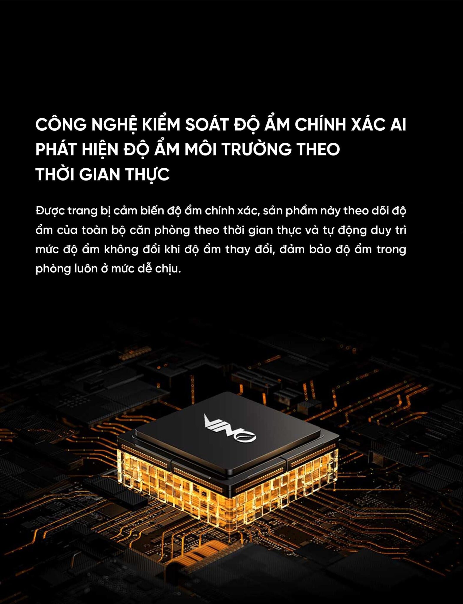 Điểm đột phá của VINO nằm ở bộ não AI thông minh. Máy được trang bị cảm biến độ ẩm thời gian thực, liên tục “lắng nghe” môi trường và tự động điều chỉnh hoạt động để duy trì độ ẩm lý tưởng do bạn cài đặt (ví dụ: 55%RH). Bạn sẽ không còn phải lo lắng về việc không khí quá khô hay quá ẩm.