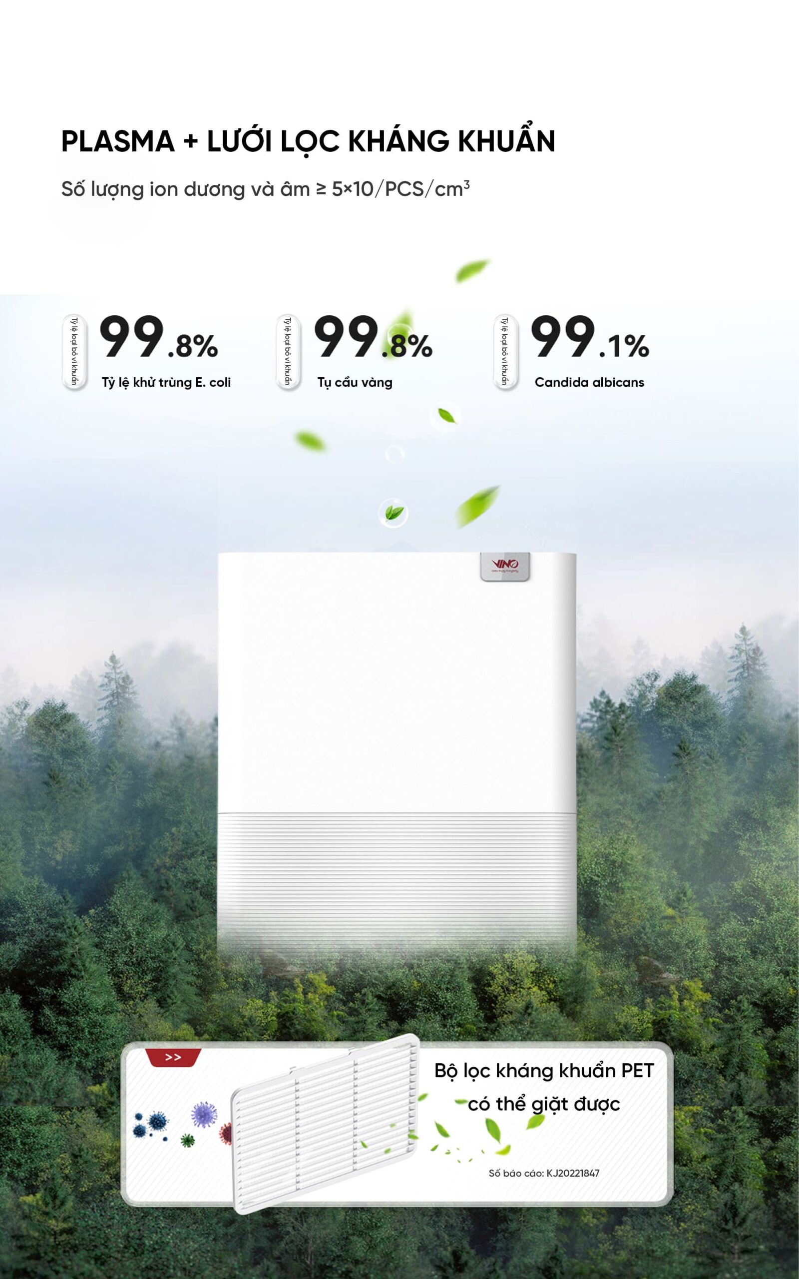 Tạo ra lượng ion lớn, kết hợp bộ lọc PET có thể giặt, loại bỏ hiệu quả E.coli, tụ cầu vàng và nấm Candida, cho không khí sạch khuẩn.